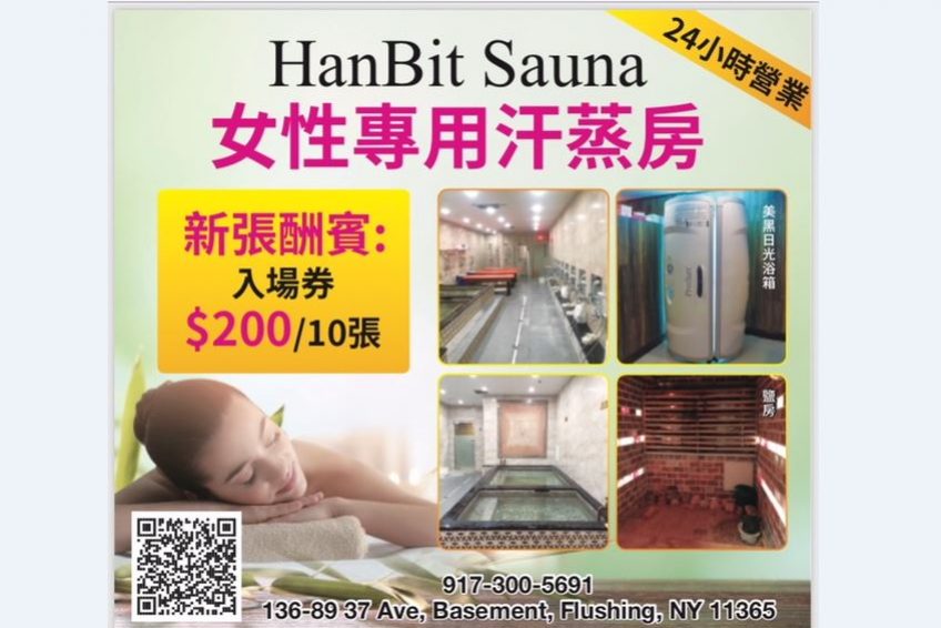 Hanbit桑拿位于37街136-89号,距缅街步行不到5分钟,是法拉盛黄金地带唯一一家24小时营业的桑拿房。Hanbit专为女士提供服务,不但可以做桑拿,还提供住宿设施。这家旅馆设备齐全,住宿环境舒适,便宜省钱,位置很好,非常干净,布置很漂亮,环境幽静,设计别致,装修风格简约大气,服务热情。性价比高。