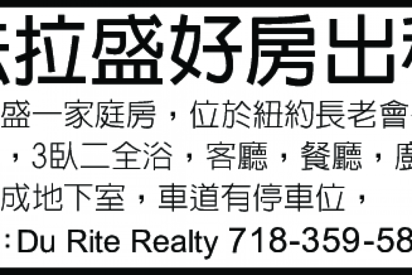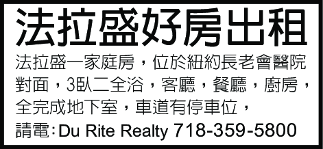 法拉盛一家庭房,位於紐約長老會醫院對面,3臥2全浴,客廳,餐廳,廚房,全完成地下室,車道有停車位,電:Du Rite Realty – 718-359-5800