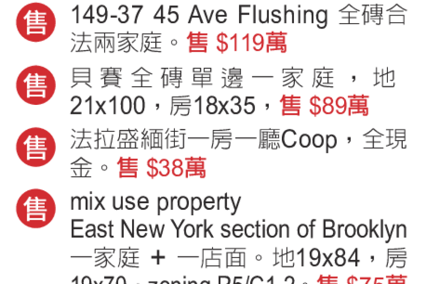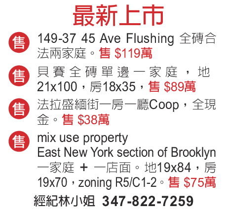 1)149-37 45 ave Flushing 全砖合法两家庭。$119萬。 2)貝賽全磚單邊一家庭,地21×100,房18×35.售$89万 3)法拉盛缅街一房一厅Coop ,全現金$38万 4)mix use property 。East New York section of Brooklyn 。 一家庭➕一店面。地19×84, 房19×70. zoning R5/C1-2 。价格75万 經紀林小姐 347-822-7259
