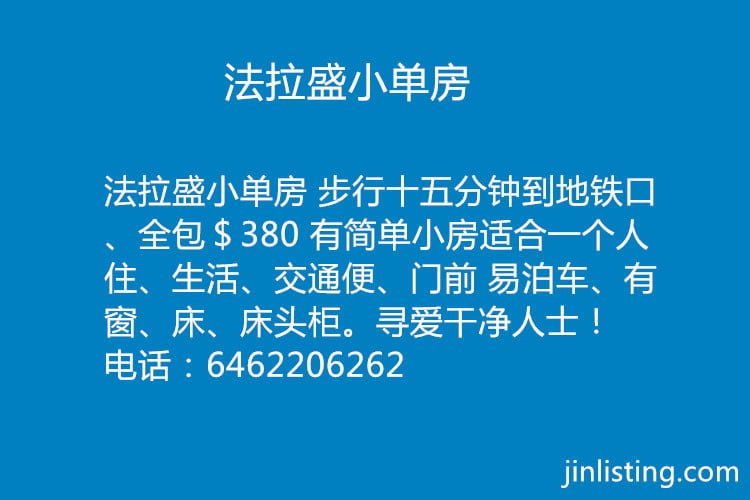 法拉盛小单房 步行十五分钟到地铁口、全包$380 有简单小房适合一个人住、生活、交通便、门前 易泊车、有窗、床、床头柜。寻爱干净人士! 电话:6462206262