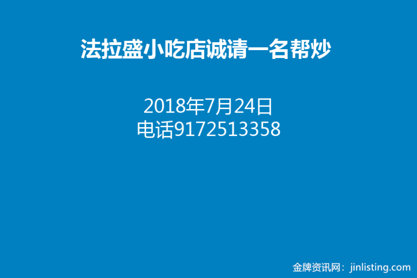 法拉盛小吃店诚请一名帮炒电话9172513358