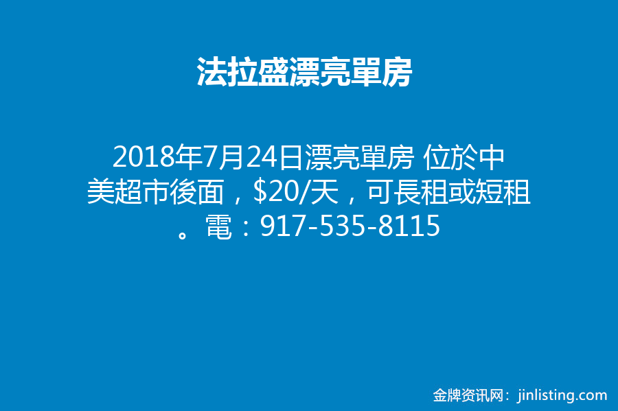 漂亮單房 位於中美超市後面,$20/天,可長租或短租。電:917-535-8115