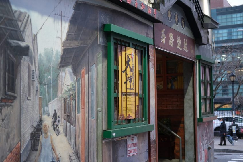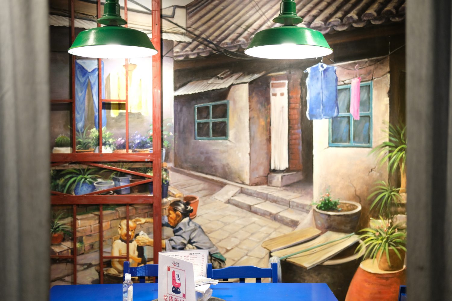 这家店就是火爆国内的怀旧成都串店“马路边边”在纽约开的首家分店。手绘的外墙壁画,李小龙电影《猛龙过江》的海报,绿色油漆的门窗框,蓝漆的桌椅,墙上贴的宣传画,这一切仿佛把人带回到70年代的中国。在远隔重洋的美国,能找到这样一家把怀旧风格做到如此细致入微的餐厅实属不易。