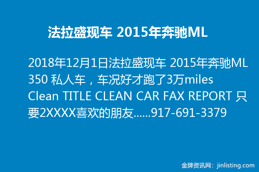 法拉盛现车 2015年奔驰ML 350 私人车,车况好才跑了3万miles Clean TITLE CLEAN CAR FAX REPORT 只要2XXXX喜欢的朋友请联系!!! 微信bin4163694 电话917-691-3379