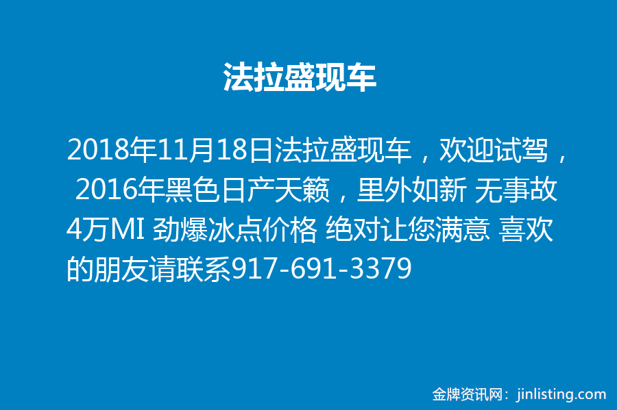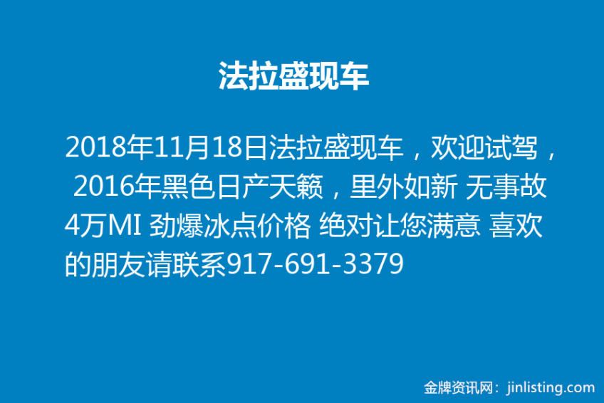 法拉盛现车,欢迎试驾, 2016年黑色日产天籁,里外如新 无事故4万MI 劲爆冰点价格 绝对让您满意 喜欢的朋友请联系917-691-3379 或者微信bin4163694