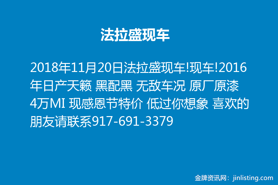 法拉盛现车!现车!2016年日产天籁 黑配黑 无敌车况 原厂原漆 4万MI 现感恩节特价 低过你想象 喜欢的朋友请联系917-691-3379 或者微信bin4163694