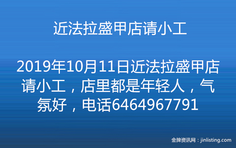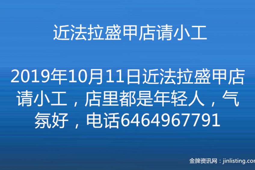 近法拉盛甲店请小工,店里都是年轻人,气氛好,电话6464967791