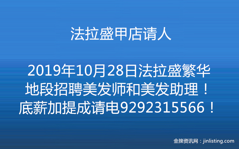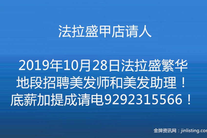 法拉盛繁华地段招聘美发师和美发助理!底薪加提成!请电9292315566!