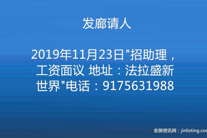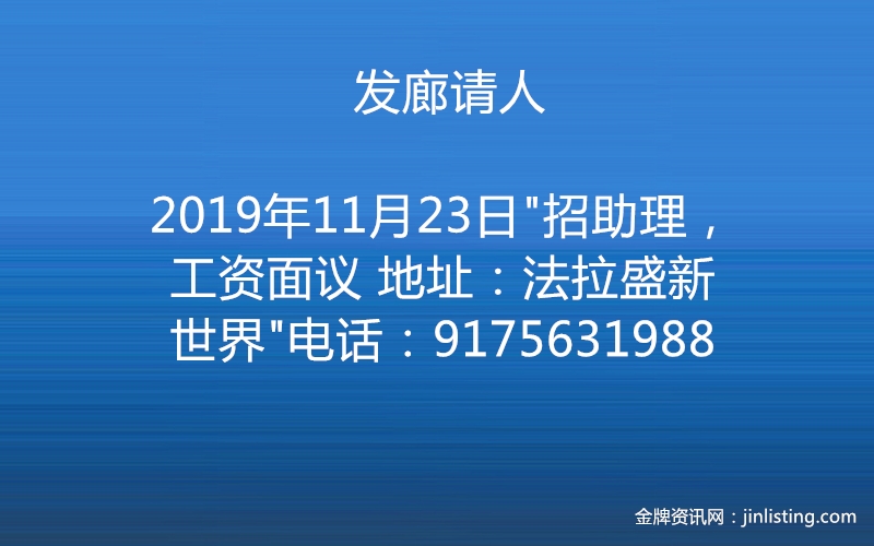 发廊请人 “招助理,工资面议 电话:9175631988 地址:法拉盛新世界”