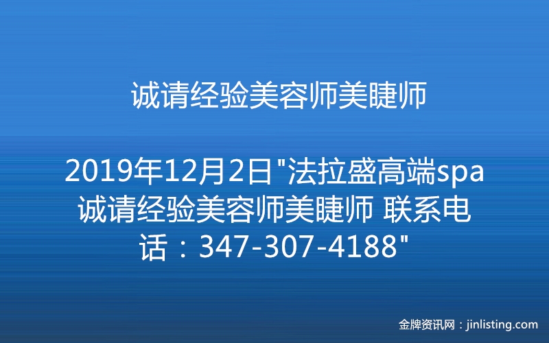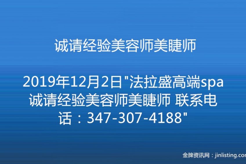 “法拉盛高端spa 诚请经验美容师美睫师 联系电话:347-307-4188”