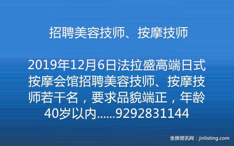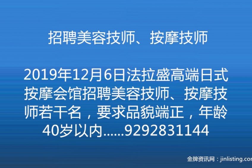 法拉盛高端日式按摩会馆招聘美容技师、按摩技师若干名,要求品貌端正,年龄40岁以内,有经验者优先。有意者电话咨询9292831144亦可短信。