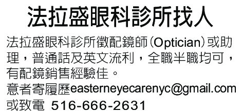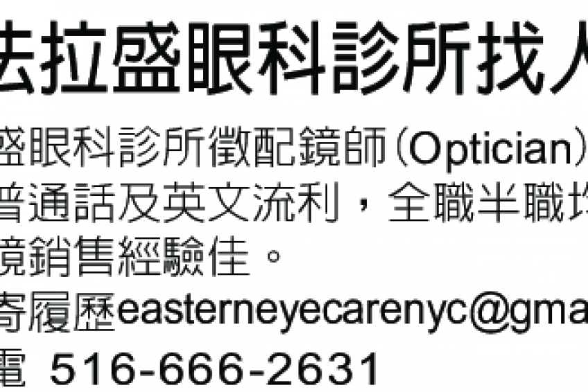 法拉盛眼科診所徵配鏡師(Optician)或助理, 普通話及英文流利,全職半職均可, 有配鏡銷售經驗佳,意者寄履歷easterneyecarenyc@gmail.com或致電516-666-2631