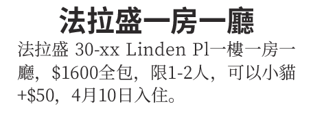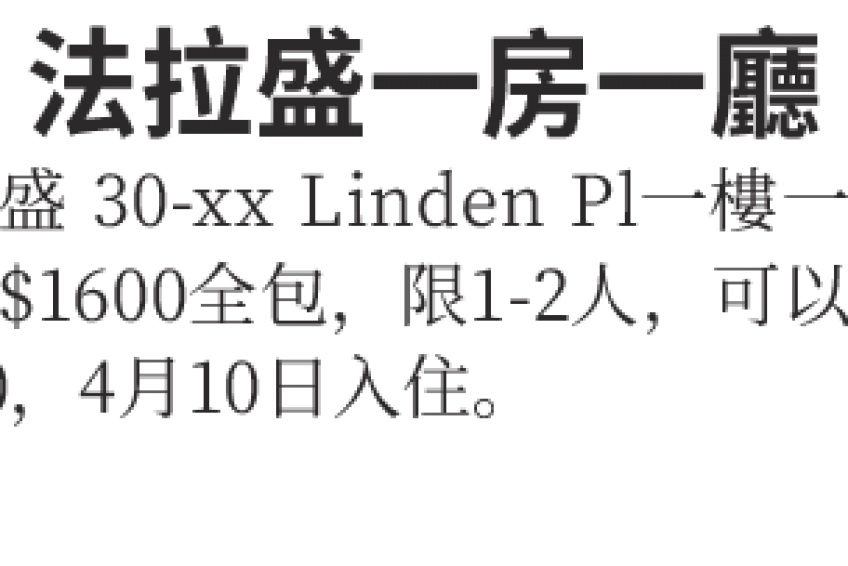 法拉盛租—30-xx linden pl一楼一房一厅$1600全包4/10 入住,限1-2人,可以小猫+50 详询请电 9293004947