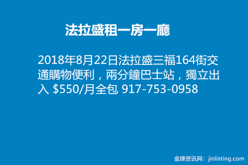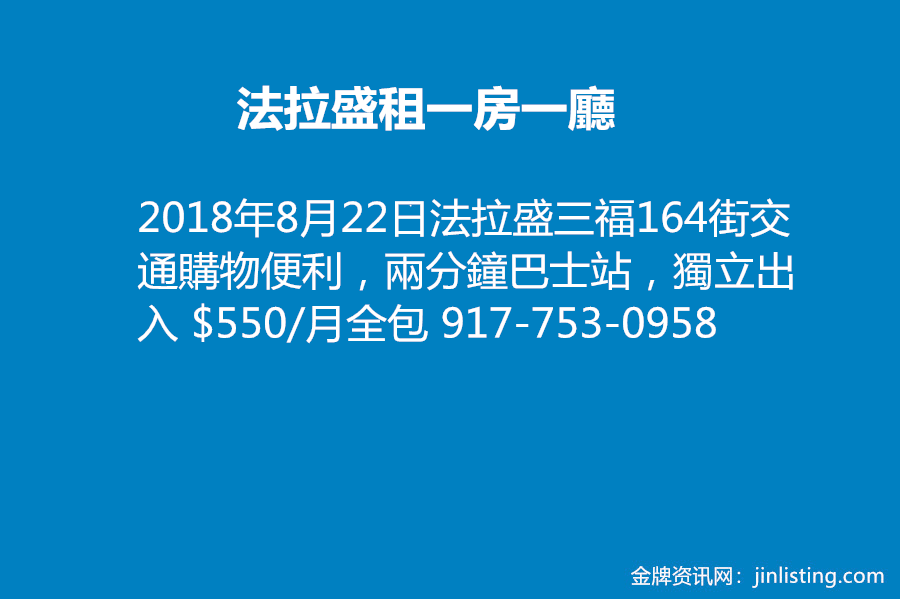 法拉盛三福164街,交通購物便利,兩分鐘巴士站,獨立出入,$550/月全包 917-753-0958