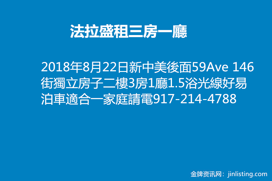 在新中美後面59Ave 146街獨立房子二樓3房1廳1.5浴光線好易泊車適合一家庭請電917-214-4788