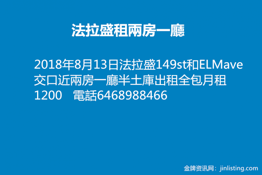 法拉盛149st和ELMave交口近兩房一廳半土庫出租全包月租1200 電話6468988466