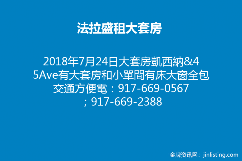 大套房凱西納&45Ave有大套房和小單間有床大窗全包交通方便電:917-669-0567;917-669-2388