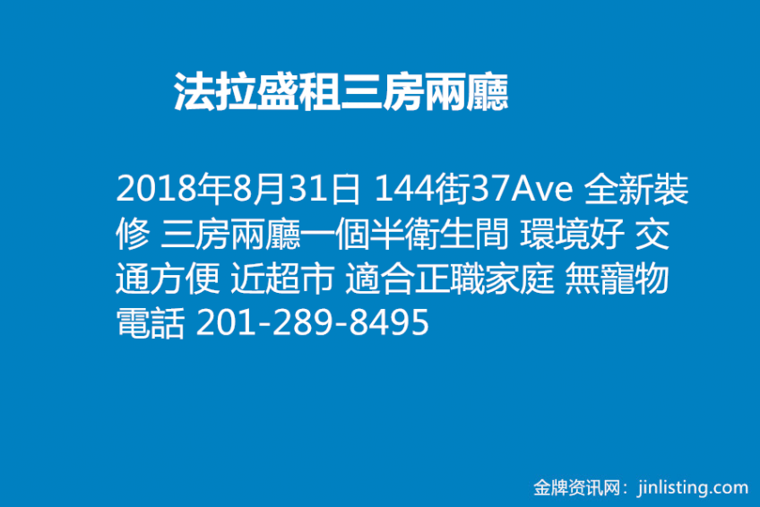 144街37Ave 全新裝修 三房兩廳一個半衛生間 環境好 交通方便 近超市 適合正職家庭 無寵物      電話 201-289-8495