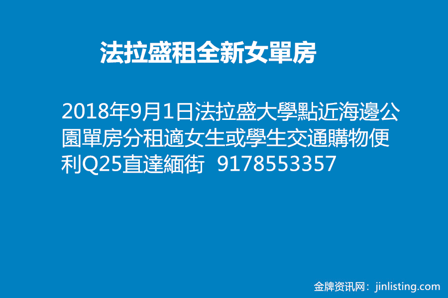 法拉盛大學點近海邊公園單房分租適女生或學生交通購物便利Q25直達緬街  9178553357/ 9176368226
