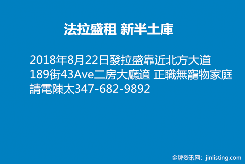 發拉盛靠近北方大道189街43Ave二房大廳巴士Q12Q13Q27適正職無寵物家庭請電陳太347-682-9892