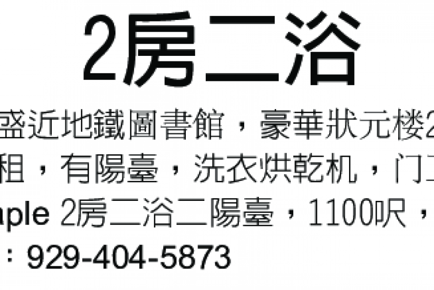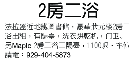 法盛近地鐵图书馆,豪華状元楼2房2浴陽臺,洗烘机,门卫出租, 另Maple2房2浴2阳台,1100呎,车位929-404-5873