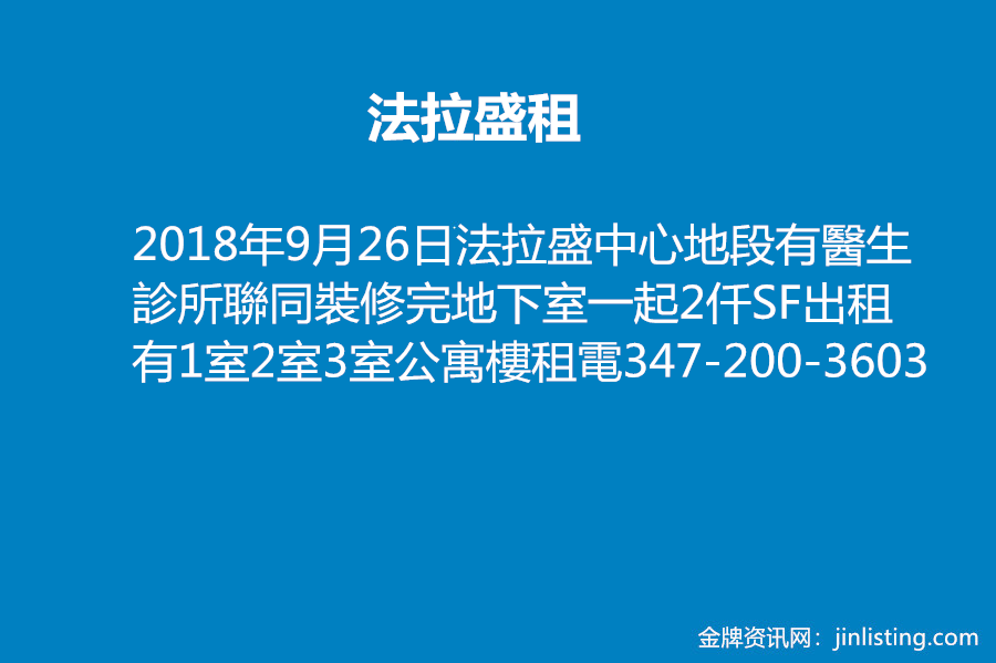 法拉盛中心地段有醫生診所聯同裝修完地下室一起2仟SF出租有1室2室3室公寓樓租電347-200-3603