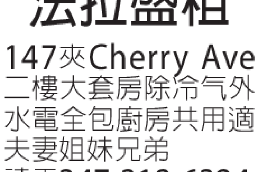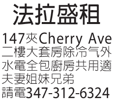 147夾Cherry Ave二樓大套房除冷气外水電全包廚房共用適夫妻姐妹兄弟請電347-312-6324
