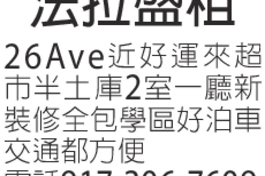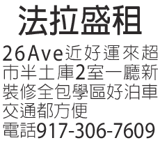 法拉盛26Ave近好运来超市半土库二室一厅新装修。全包学区好泊车交通都方便!电话917-306-7609