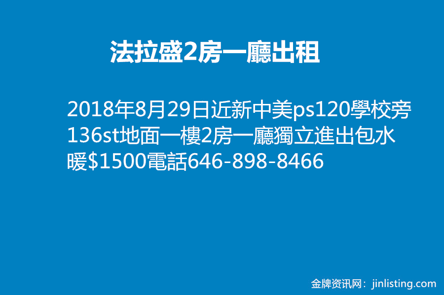 近新中美ps120學校旁136st地面一樓2房一廳獨立進出包水暖$1500電話646-898-8466