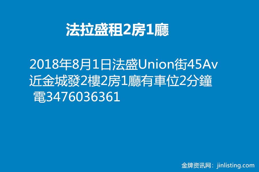 法盛Union街45Av近金城發2樓2房1廳有車位2分鐘Q17/27/25/34 電3476036361/7184158188