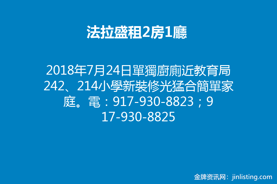2房1廳 單獨廚廁近教育局242、214小學新裝修光猛合簡單家庭。電:917-930-8823;917-930-8825
