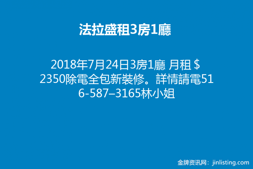 3房1廳 月租$2350除電全包新裝修。詳情請電516-587–3165林小姐