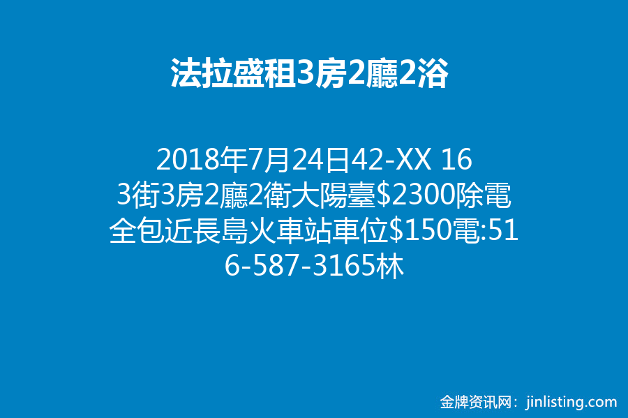 42-XX 163街3房2廳2衛大陽臺$2300除電全包近長島火車站車位$150電:516-587-3165林