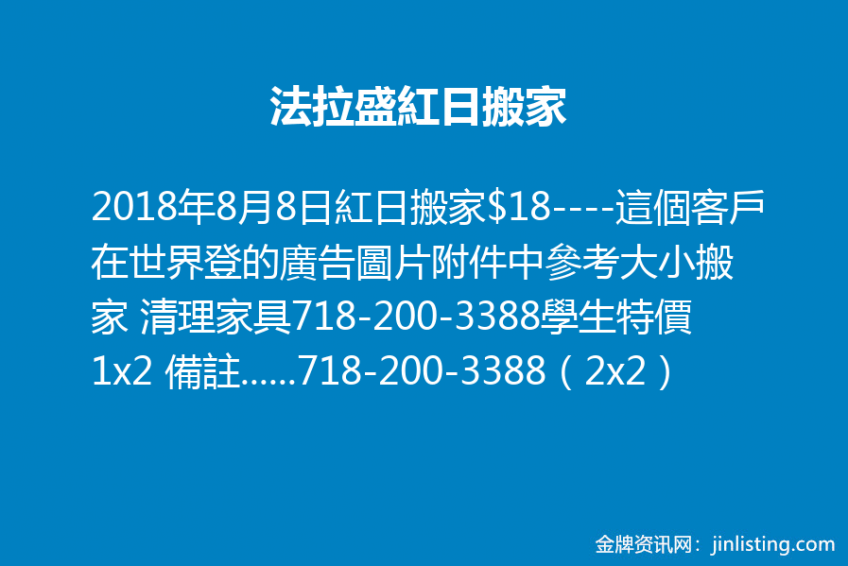 紅日搬家$18—-這個客戶在世界登的廣告圖片附件中參考