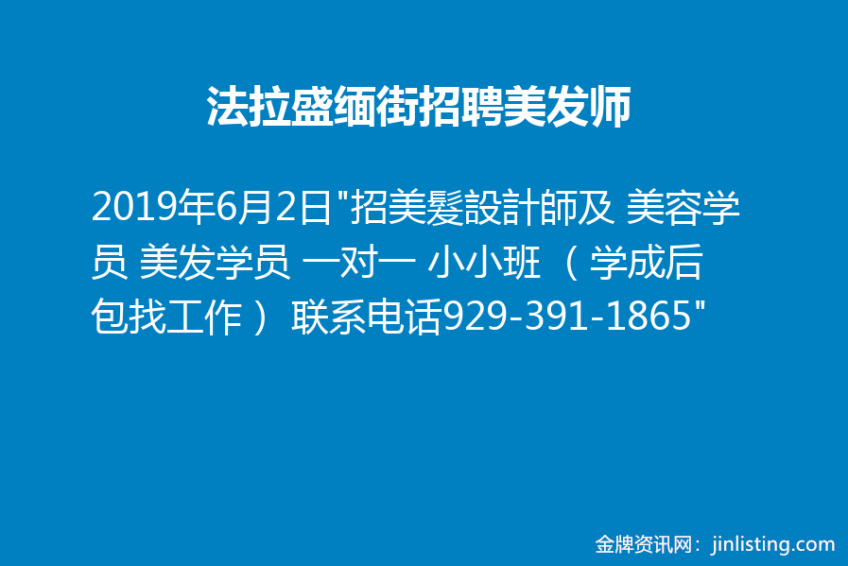 法拉盛缅街招聘美发师 “招美髮設計師及 美容学员 美发学员 一对一 小小班 (学成后包找工作) 联系电话929-391-1865”