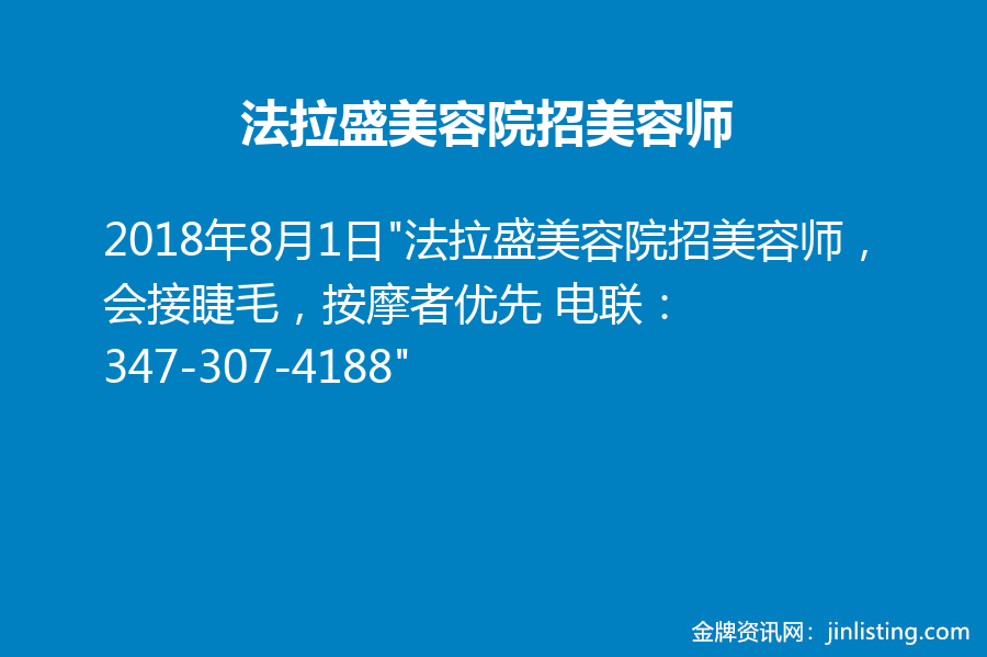 “法拉盛美容院招美容师,会接睫毛,按摩者优先 电联:347-307-4188”