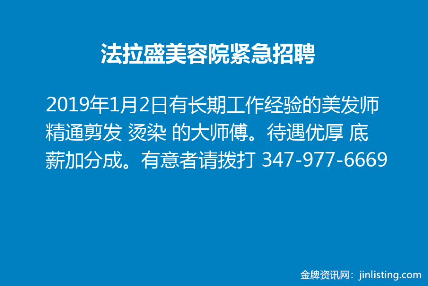 法拉盛美容院紧急招聘 有长期工作经验的美发师 精通剪发 烫染 的大师傅。待遇优厚 底薪加分成。有意者请拨打 347-977-6669