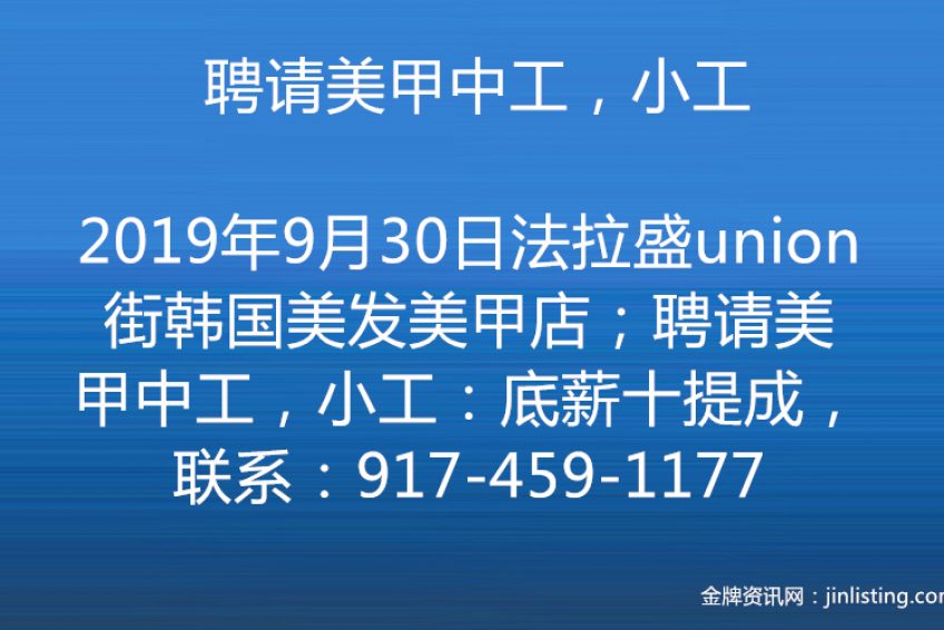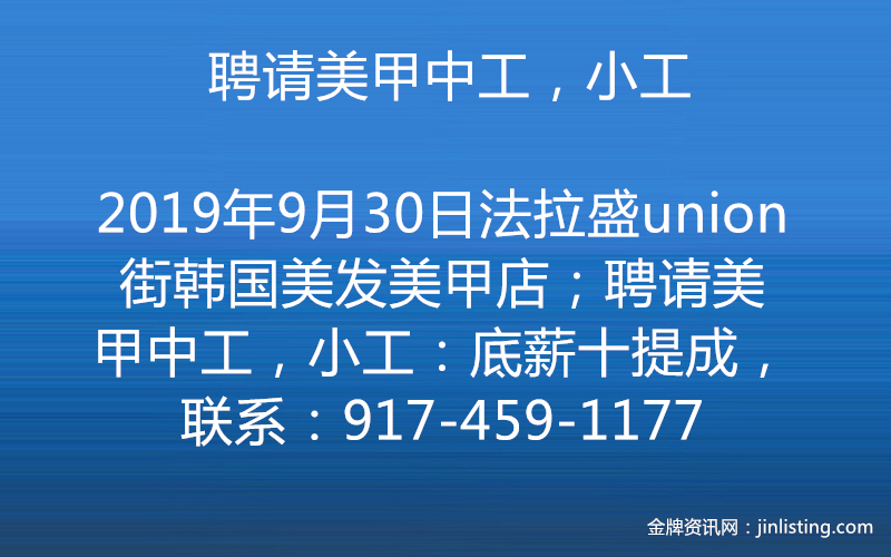 法拉盛 union 街韩国美发美甲店;聘请美甲中工,小工: 底薪十提成,联系:917-459-1177