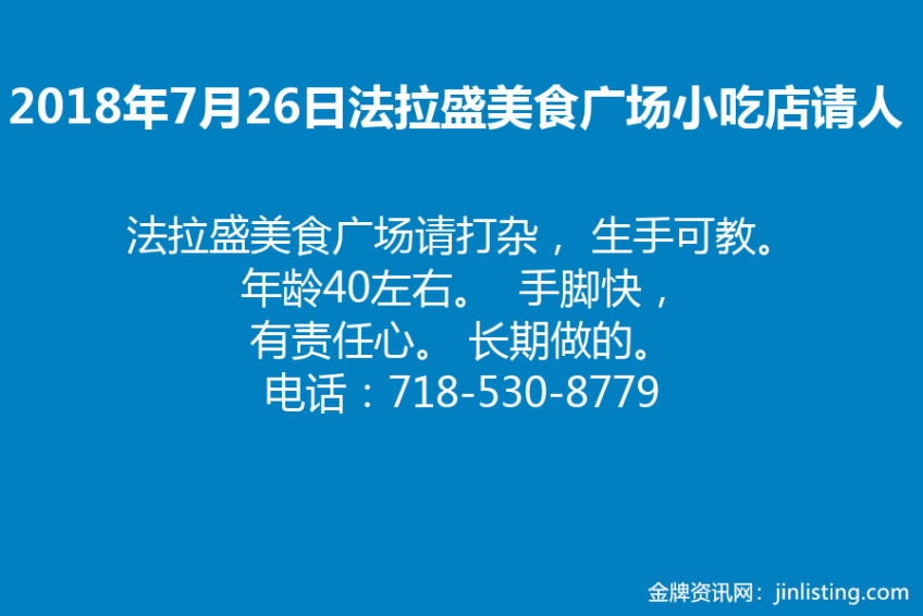 法拉盛美食广场小吃店请人 法拉盛美食广场请打杂, 生手可教。 年龄40左右。 手脚快, 有责任心。 长期做的。 电话:718-530-8779