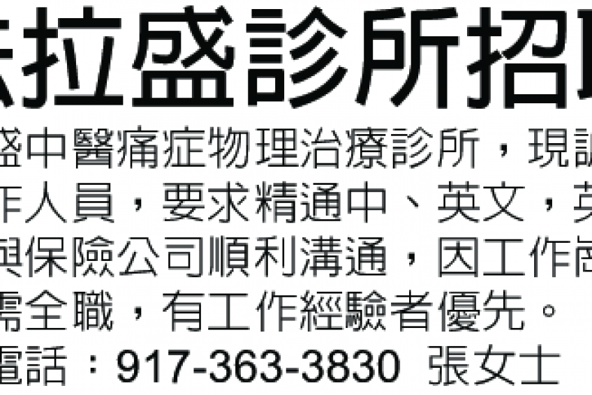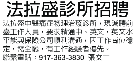 法拉盛中醫痛症物理治療診所,現誠聘前臺工作人員,要求精通中、英文,英文水平能與保險公司順利溝通,因工作崗位穩定,需全職,有工作經驗者優先,工作地點:法拉盛 聯繫電話(917) 363-3830 張女士