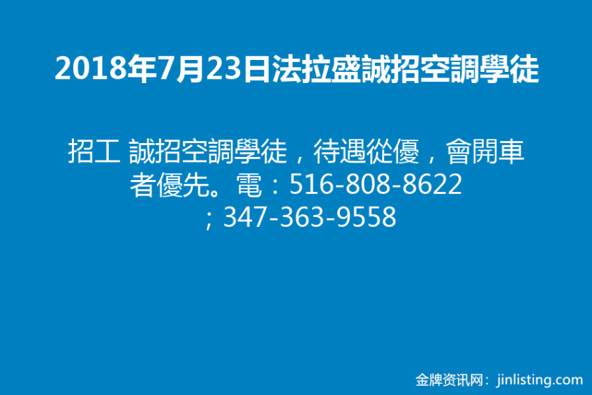 招工 誠招空調學徒,待遇從優,會開車者優先。電:516-808-8622;347-363-9558
