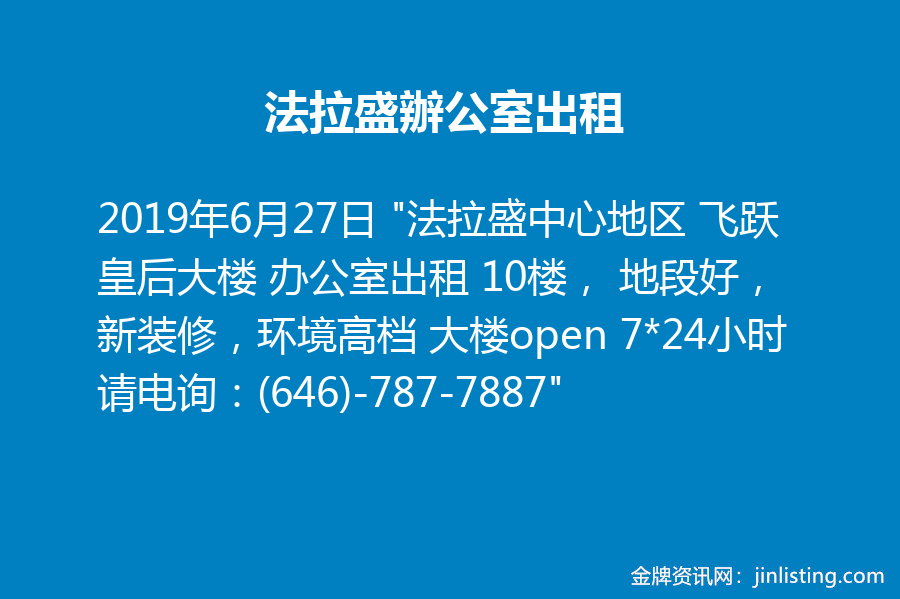 “法拉盛中心地区 飞跃皇后大楼 办公室出租 10楼, 地段好,新装修,环境高档 大楼open 7*24小时 请电询:(646)-787-7887”