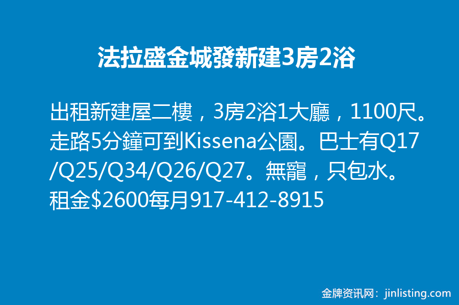 出租:法拉盛中心,金城發後面走路6分鐘,新建屋二樓,3房2浴1大廳,1100尺。走路5分鐘可到Kissena公園。巴士有Q17/Q25/Q34/Q26/Q27。無寵,只包水。租金$2600每月。有意請電順成地產曾先生917-412-8915。