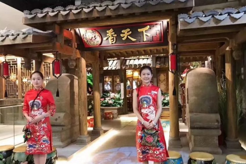 香天下门口迎宾的服务员颜值还算不错,穿着漂亮的中国风刺绣红旗袍忙进忙出的。