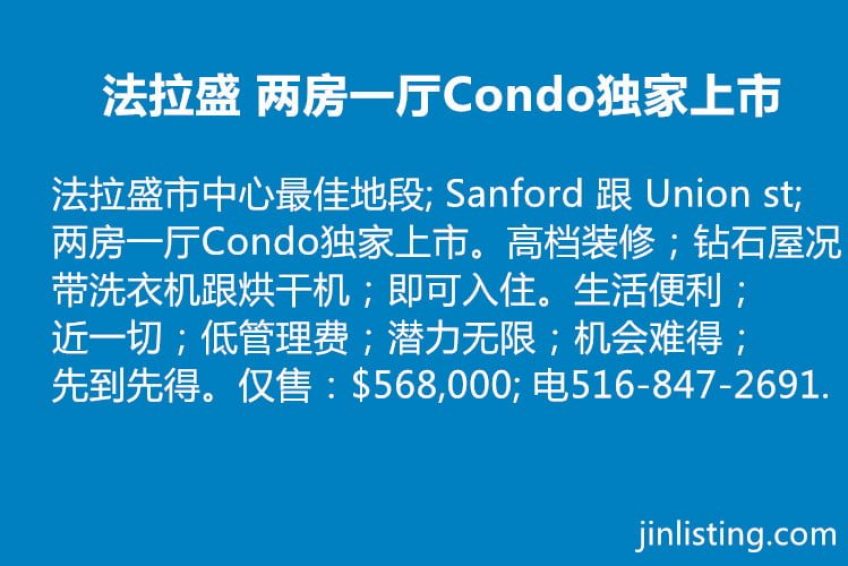 法拉盛市中心最佳地段; Sanford 跟 Union st; 两房一厅Condo独家上市。高档装修;钻石屋况;带洗衣机跟烘干机;即可入住。生活便利;近一切;低管理费;潜力无限;机会难得;先到先得。仅售:$568,000; 电516-847-2691.