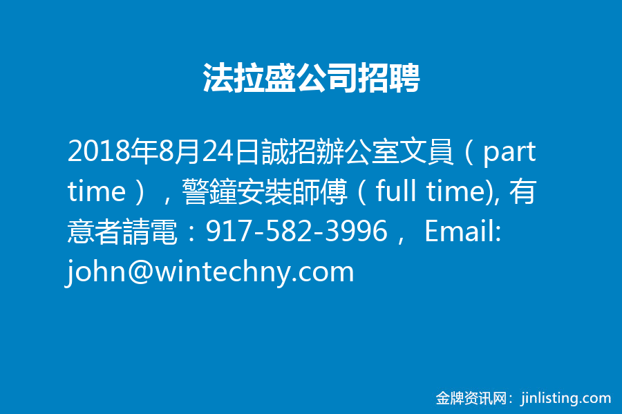 誠招辦公室文員(part time),警鐘安裝師傅(full time), 有意者請電:917-582-3996,