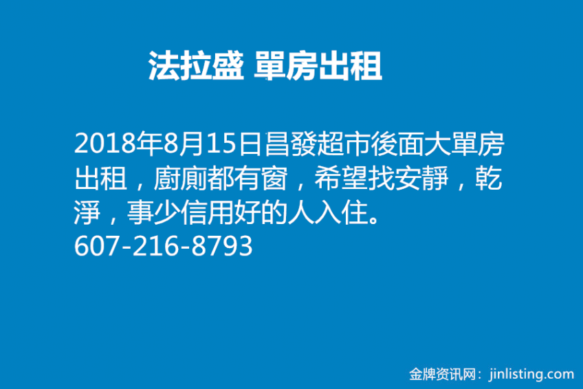 昌發超市後面大單房出租,廚廁都有窗,希望找安靜,乾淨,事少信用好的人入住。 607-216-8793