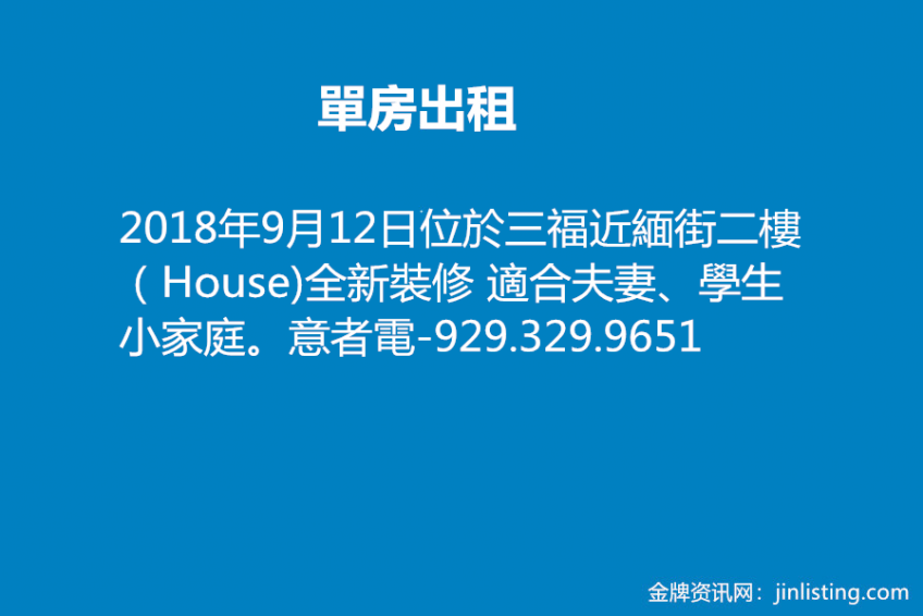 位於三福近緬街二樓(House)全新裝修。適合夫妻、學生,小家庭。意者電-929.329.9651