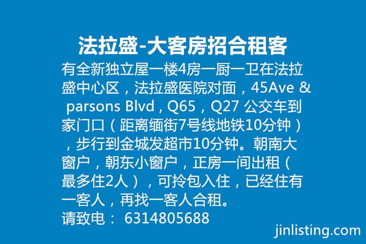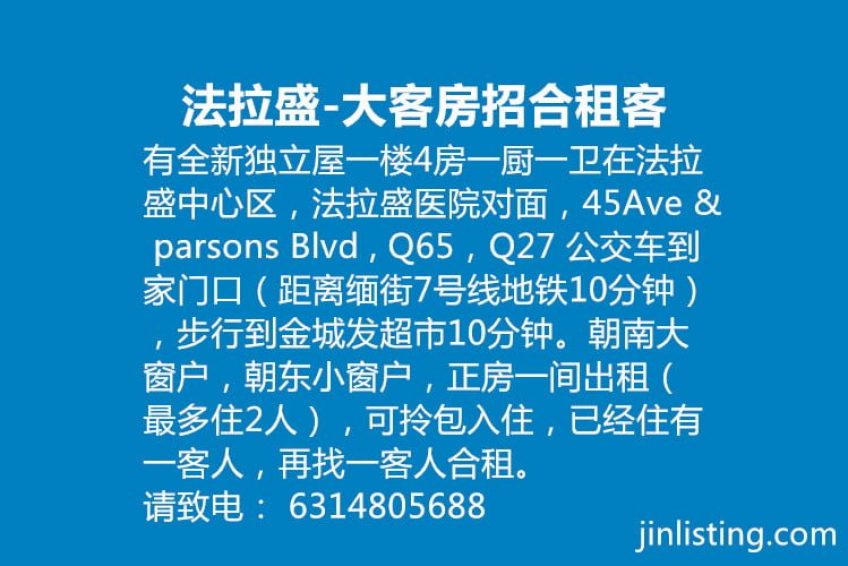 有全新独立屋一楼4房一厨一卫在法拉盛中心区,法拉盛医院对面,45Ave & parsons Blvd , Q65,Q27 公交车到家门口(距离缅街7号线地铁10分钟),步行到金城发超市10分钟。附近中西餐馆,洗衣房,9毛9店齐全,独立house一楼附带花园,全新精装修,有家具(书桌,床柜,椅子,壁橱),朝南大窗户,朝东小窗户,正房一间出租(最多住2人),可拎包入住,中国大陆的游客请提前预约,去机场有专车接送。已经住有一客人,再找一客人合租。出租一个月至二个月的,每晚20美元。出租一年以上的优惠每月450美元 ,水电气网络全包,夏天用空凋每月加电费50美元。 希望招租长期租客,无孩子不抽烟不酗酒不养宠物,不喧哗,爱干净整洁卫生,轻煮少油烟,容易相处,礼貌谦让的学生或正职男士。 可随时看房,7月份入住。请致电: 6314805688 (早上7点——晚12点)。难得好房,优质民宿,请当机立断![b]