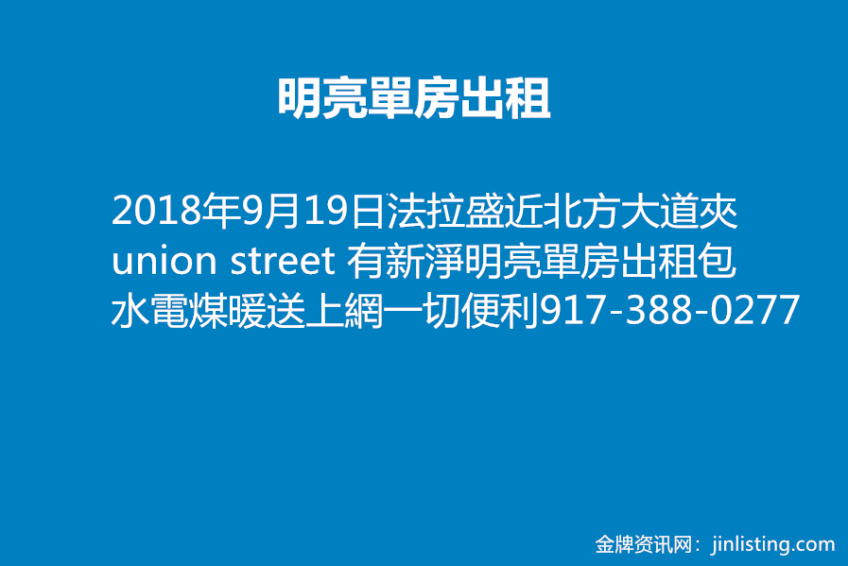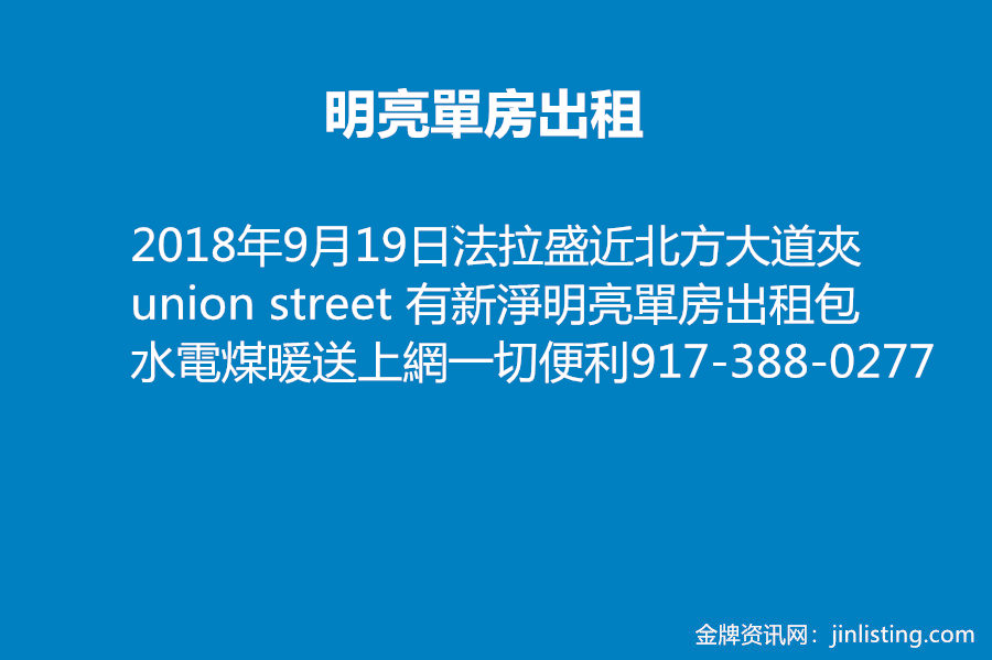 法拉盛    近北方大道夾union street 有新淨明亮單房出租包水電煤暖送上網一切便利。917-388-0277